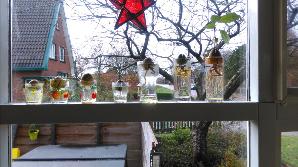 Verder heb ik het eindelijk voor elkaar gekregen om een paar avocados te laten wortelen boven een glas water. Dit heeft ook heel veel pogingen gekost en bij deze jongens staat de oudste al sinds Juni voor het raam. Laatst van de "voor de kat-veilige", maar te koude kinderkamer naar bedenen gehaald.