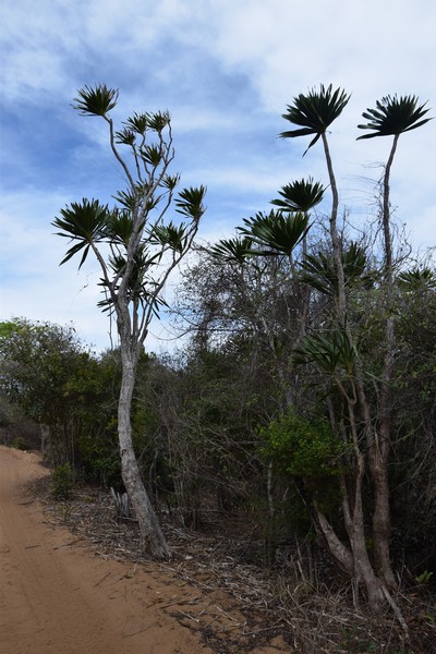An majestic moderate to large solitary unarmed tree palm. TRUNK up to 20m, 31cm diam. (Near crown 18cm); Base sometimes bulbous; Nodal scars faint, nodes 1cm, internodes 3-5cm, sometimes longitudinal holes where mouse lemurs sleep, usually no remnants of sheaths. LEAVES 18-32 in the crown, porrect to slightly arching when positioned in sun; Sheath, Open, length 50cm, wide 35cm, brown-tomentose externally; Petiole, length 30-40cm wide 4-8cm, convex with sharp edges; Rachis length 2,9m, mid leave convex and white-, green, to brown tomentose; Leaflets regular, rigid, lanceolate, oblique, straight, acute, dark green, 49 on each side of the rachis, leaflet length 55cm near the petiole to 80cm near the middle and end. PISTILLATE INFLORECENCE interfoliar, solitary, grey brown tomentose, total length 130cm, branched to 1 order, peduncle length 60cm, rachis length 54cm, rachillae 40 – 70, lower rachillae length 33cm highest rachillae length 16cm, FRUIT obovoid to oblong. EOPHYLL bifid