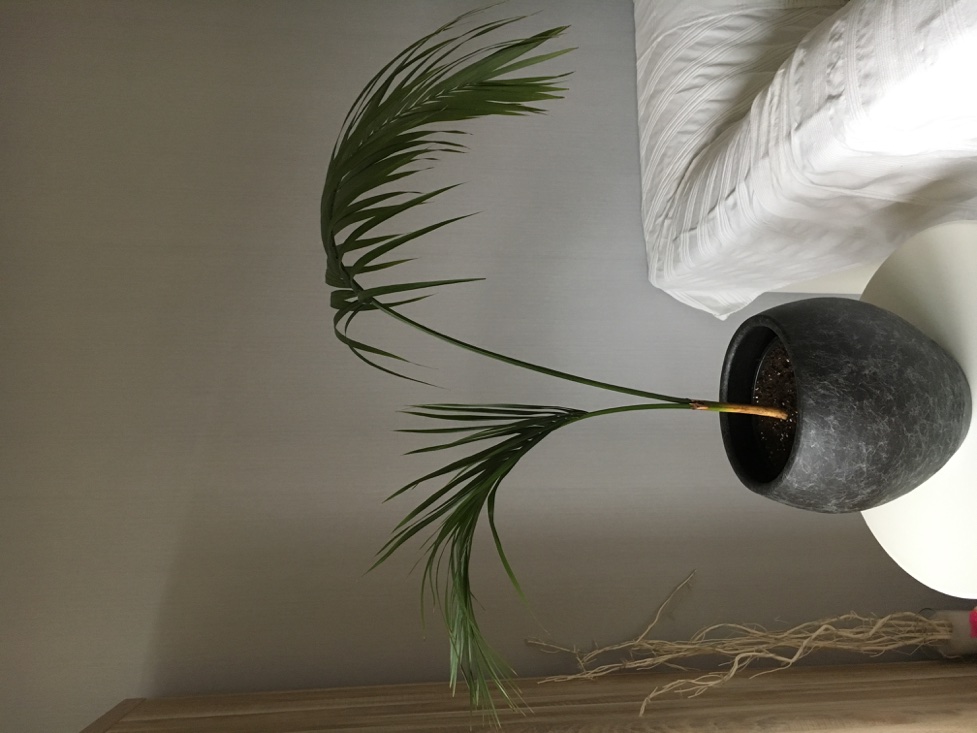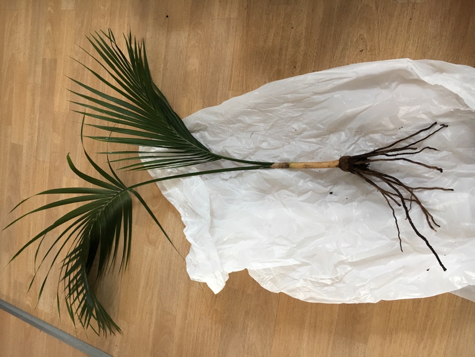 Howea forsteriana of kentiapalm is vermoedelijk juist. Ik ben benieuwd of de stek zal aanslaan. Voor een plant van deze leeftijd zitten er weinig wortels aan. Hij zou dieper mogen worden staan, maar de wortels schuilen tenminste ondergronds. Ik mis de bladresten die er doorgaans aanzitten. Die zijn waarschijnlijk gestript? Ik zou de bladeren i.i.g. dagelijks nevelen om uitdroging door verdamping te voorkomen.