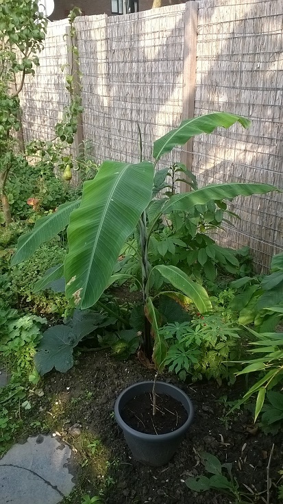 Deze bananensoort heb ik als zaad gekocht onder de naam Musa itinerans forma India. Er zijn twee zaden gekiemd. Het is een snel groeiende soort. Afgelopen zomer heeft ie buiten gestaan. Bij de eerste nachtvorst ging al het blad kapot. Nu hij binnen staat groeit hij langzaam verder.