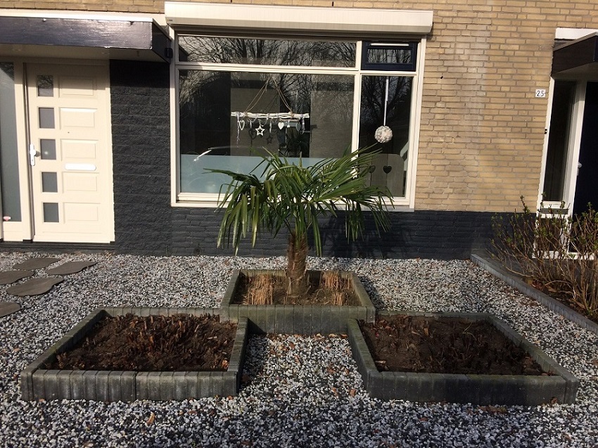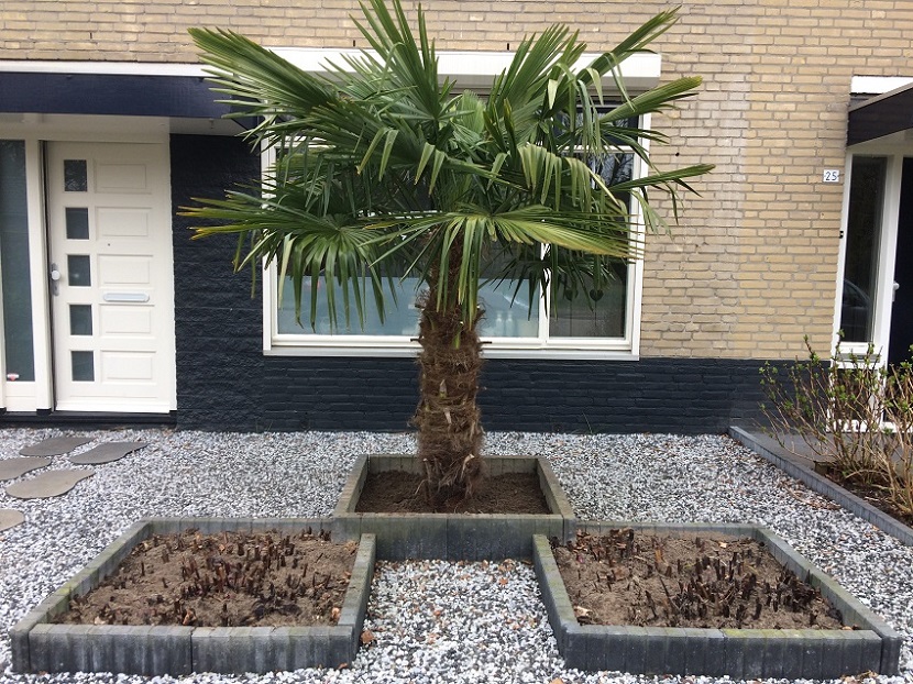 Vanmorgen kreeg ik van vrouwlief een triest aandoende foto toegestuurd dat de palm was omgewaaid. We hebben hem maar laten liggen want morgen komt er storm. Drukke periode dus nog geen tijd gevonden voor de aanplant.