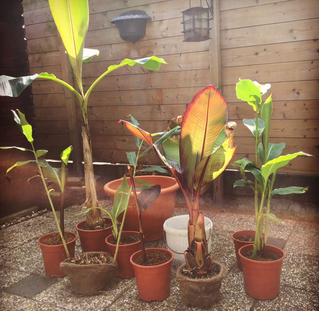 Olijf (eigen kweek), Musa basjoo, Musa Rubinea, Crinum bulbispermum (eigen kweek), en wat Irissen