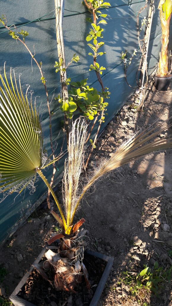 De palm staat nu 1 maand terug in de tuin hij heeft de hele tijd vorstvrij gestaan in de winter Nu heeft hij 1 mooi blad maar de andere verdorren eer ze open zijn Vreemd