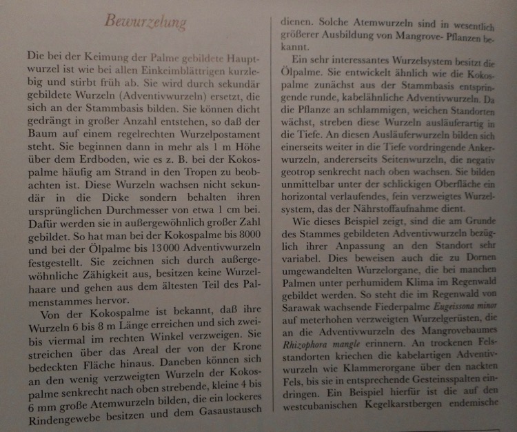 Hierbij een fragment uit het boek van botanicus Prof. Dr. Karl Lotschert (Palmen - Botanik, Kultur, Nutzung uitgave Ulmer 1985). Dat de talrijke adventiefwortels zeer lang kunnen worden is juist. Met alleen de abusievelijk als 'penwortel' aangeduide kiemwortel zou een volwassen palm niet overeind blijven, laat staan een hurricane doorstaan. Daarvoor zorgt een dichte massa van taaie adventiefwortels De lange kiemwortel bij zaailingen is zoals in dit fragment beschreven kortlevend.