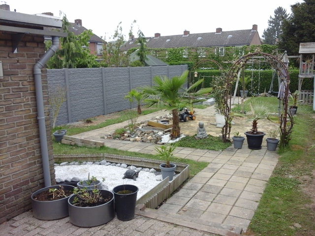 Hij komt 80 cm onder en 65 cm onder de grond...ik doe alleen gefaseerd de grond eruit halen en verdelen over de tuin. Ik heb inmiddels ook al een glasplaat gehaald van 120x60cm en 2,5cm dik. Bedoel is de 2 vijvers in de tuin met elkaar te gaan verbinden middels een beekloop van 11meter lang