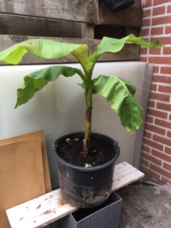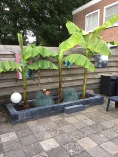 Twee jaar terug begon onze verslaving; We wilden eens wat anders in de tuin. Een vriend van ons had een stek van een kleine bananenboom en zo begon het...Simpel in een oude betonemmer en overwinterd in de schuur. Vorig jaar twee kleine pups laten groeien, ook weer in emmers en uiteindelijk toch in vaste grond gedaan. Via via heel goedkoop aan de witte platen gekomen, die hun werk als kas goed hebben doorstaan deze winter: geen vorst in de bakken en voldoende warm en licht. Dit jaar hebben we ze op 31 maart uit hun kas gehaald en nu zijn ze zo groot en hebben we weer een pup in een emmer gedaan..