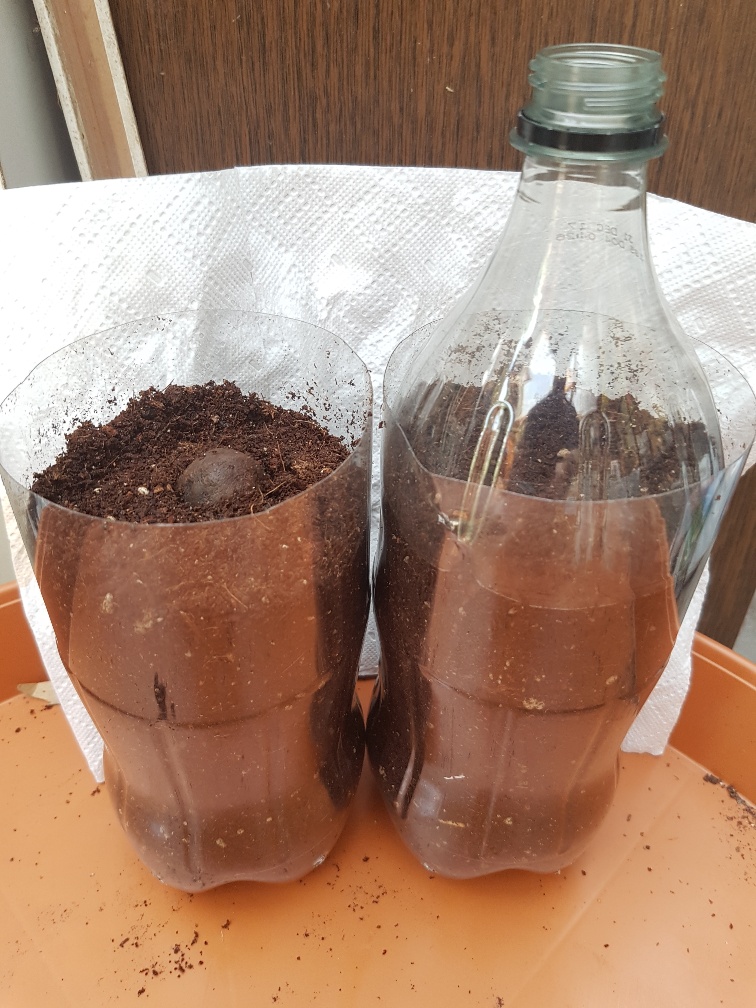 1.5 literfles cola genomen en kop eraf gesneden, 12 gaatjes onder in de fles geboord 1 noot 3/4 in de vochtige kokos/palmaarde gedrukt en kop van de fles er weer overheen geplaatst, soort van minikas gemaakt met toch "ventilatie". Andere hetzelfde maar volledig onder de aarde en aangedrukt.