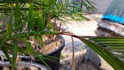 Daarnaast had ik een andere canariensis, met maar een heel beperkte aantasting van speerrot. Je merkt het wel nog aan het blad (dat toen aan het groeipunt zat), maar de palm groeit rustig verder. Zie 2de foto.