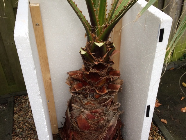 Vorige winter was ik erg tevreden over de bescherming die ik had aangebracht. Alle reden dit te herhalen. Vandaag heb ik laatste voorbereidingen getroffen. De Washingtonia R. was enorm gegroeid dit jaar, dus allereerst moest ik overtollig blad verwijderen. De verwarmingskabel aangebracht en als laatste een stevige behuizing geplaatst van 5cm dikke styropor platen. Bij de eerste de beste vorst van betekenis is het slechts nog een kwestie van de hoes er overheen trekken.