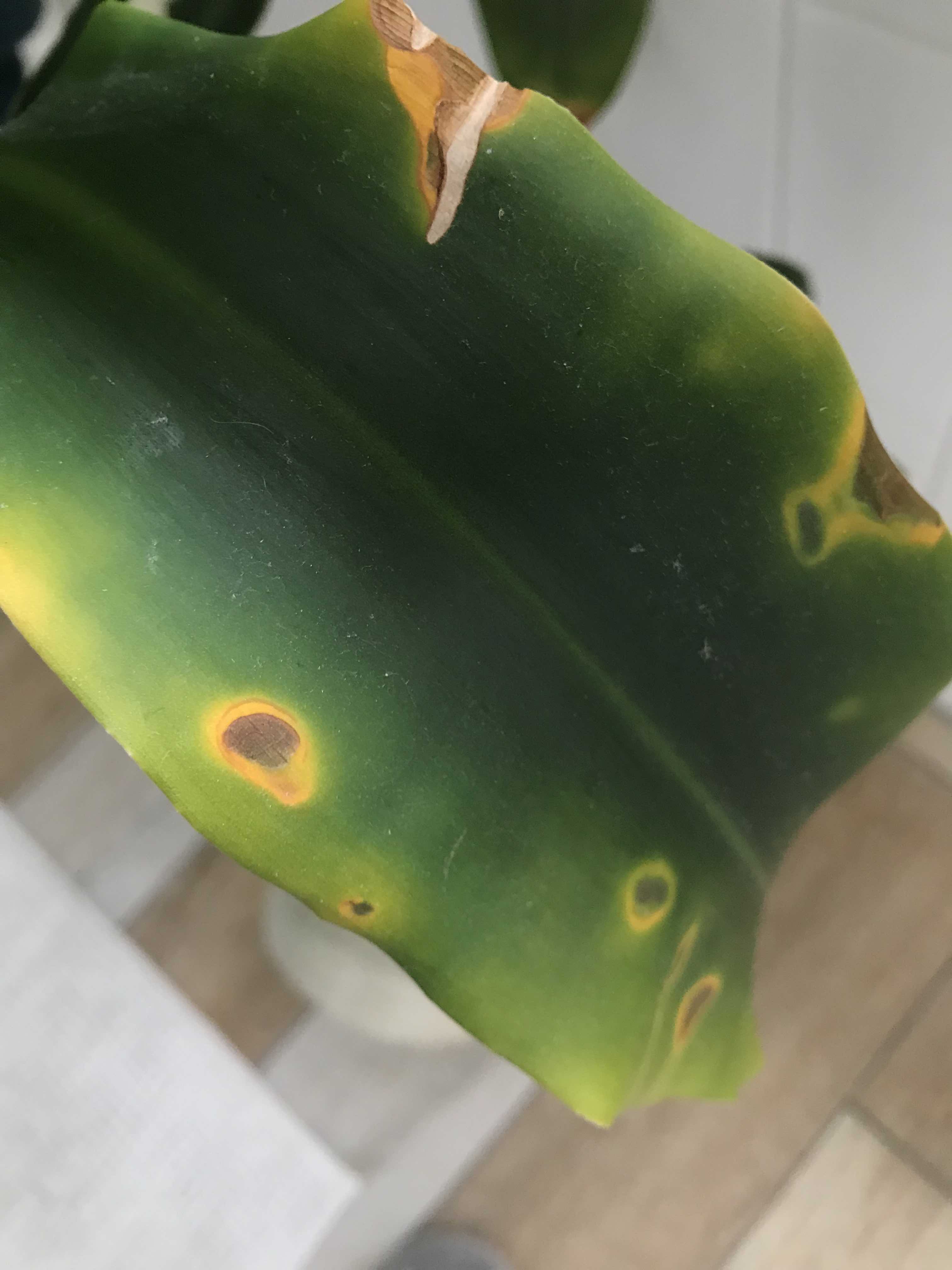Het gaat om een plant die lelijke bladeren heeft, op twee manieren. Hij staat in de badkamer, dus vrij hoge luchtvochtigheid en zonnig, maar niet direct in de zon. Ik geef de plant gemiddeld elke twee weken water. Hierbij wat foto's