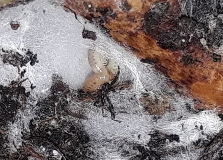 Mijn palm heeft heel veel kleine, witte wormpjes (met pootjes, dus meer duizendpootjes) bij de stam zitten. Ze lijken zich te nestelen in een soort witte schimmel/web. Zie foto!