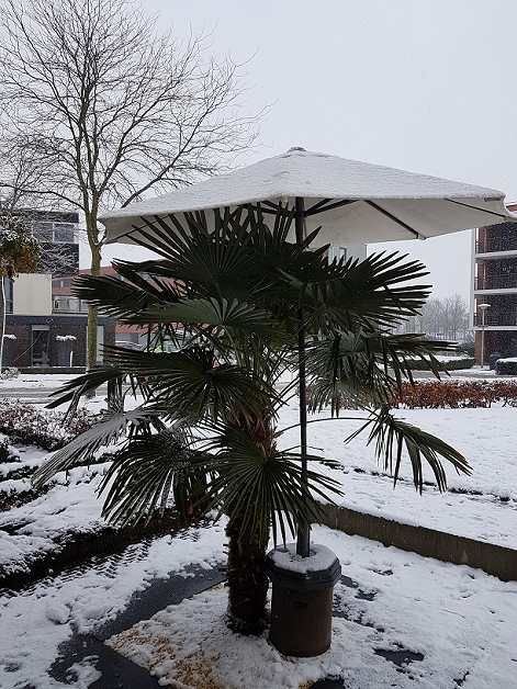 Beschermen jullie je Trachys met een paraplu met dit weer? Ik heb ze tot dusver aan hun lot overgelaten, ondanks dat dit hun eerste winter in de volle grond is. Ik ging ervan uit dat deze -2 graden die op beschutte plekken misschien slechts 0 graden blijft geen serieuze schade kan opleveren. Echter zie ik wel de sneeuw in het hart van de palmpjes zitten. Als de dood nu dat dit smelt en dan weer opvriest en voor schade / speerrot zorgt. Wat denken jullie? En als er schade is: wanneer is dat zichtbaar?