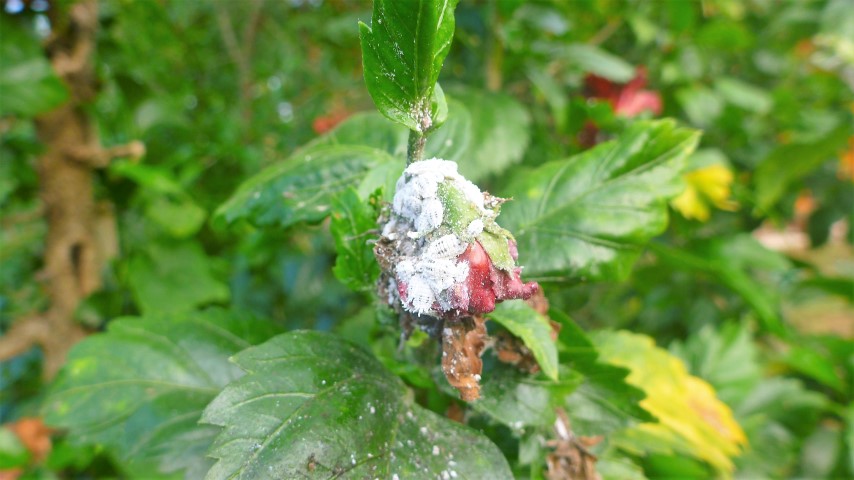 Ik heb een Hibiscus waar veel bloemen in kwamen. Maar nu blijven de bloemen in de knop en er zit iets wits op. Lijkt wel een luis of zo.