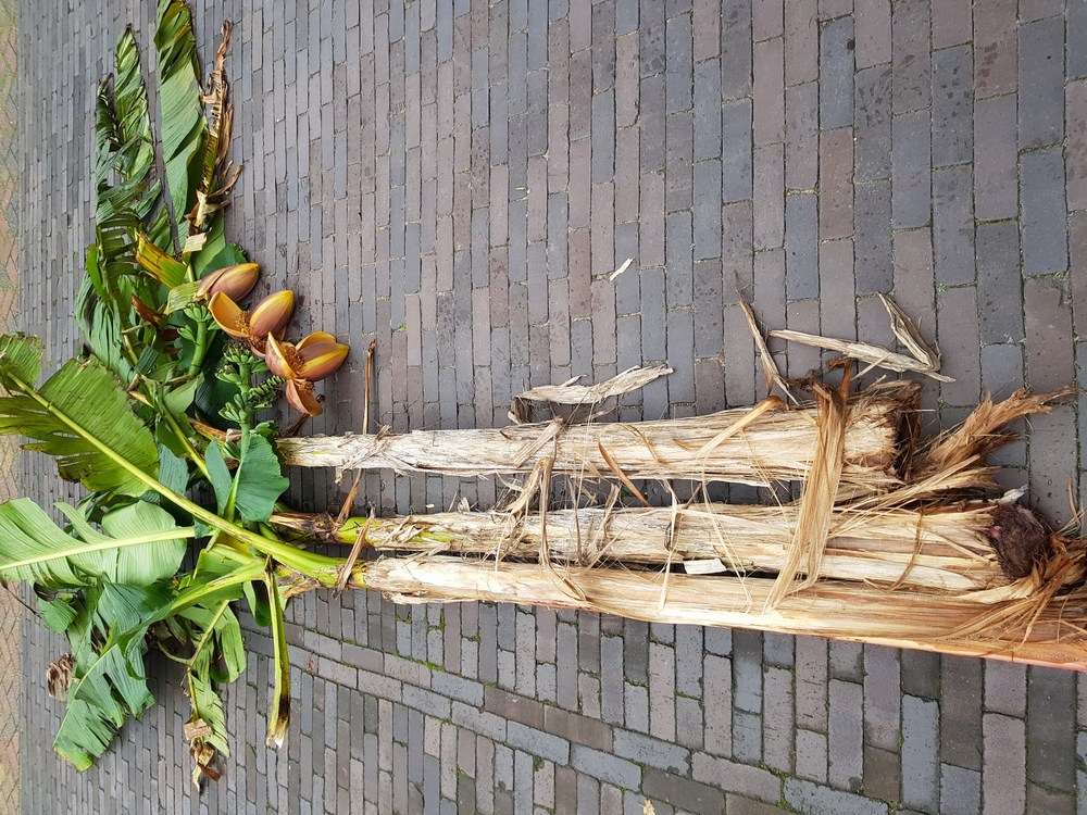 Hier Musa basjoo, hoogte 4 m, stamhoogte 2,5 m, overwinterd in de groene kliko....
