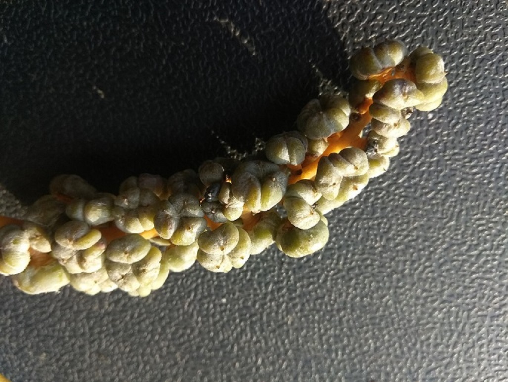 vanaf de stam zijn verschillende zaden met een vorm als pompoenen en op de 2e helft van de tak gewoon gladde zoals normaal ( boonvormig).