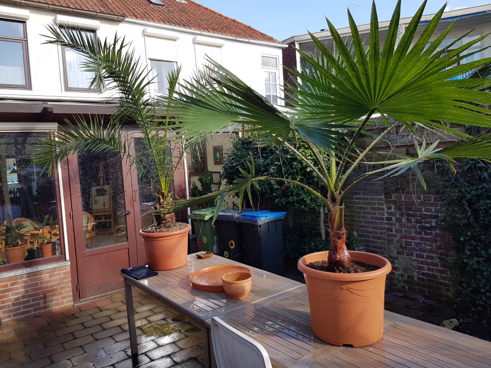 :) hier hopelijk geen sneeuw Eduard en bedankt voor het meedenken. Ze hebben iig een lekkere verdiende douche gehad in het zonnetje :). Nieuwe speren in de Washingtonia staan er dikker bij dan ooit. En de Phoenix is al weer toe aan een wortelsnoei, Krap 2 jaar geleden en nu alweer de pot uitgroeiend, wortels groeien omhoog, zal daar ook een een gedetailleerdere foto van maken, lijkt net een spijkerbed rond de stam.