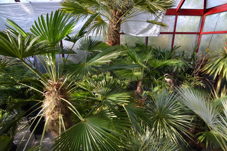 Ik verwacht hier ook weinig van Eduard. Als de Latania de overwintering in de kas overleeft dan is dat een klein mirakel. Soms wordt je verrast zoals de afgelopen zomer door Dypsis decaryi. Afkomtig uit de warme kas stond deze hier de hele zomer buiten en kreeg er zelfs een nieuw blad bij. Binnenshuis groeit deze lichtbehoeftige palm uit tot een slungel. Vooralsnog overwintert de Dypsis bij ± 10°C voor een raam op NO dat meestal openstaat vanwege het drogende wasgoed. Een nieuwe Latania staat ernaast. Sommige soorten zijn verrassend vergevingsgezind en passen zich makkelijk aan bij uitersten. Van Ravenea glauca overwintert nu een exemplaar zowel in de woonkamer bij 18-20°C als in de kas bij 2-4°C. Chambeyronia heeft ook geen enkel probleem met de jaarlijkse verplaatsing van de woonkamer naar buiten vice versa.