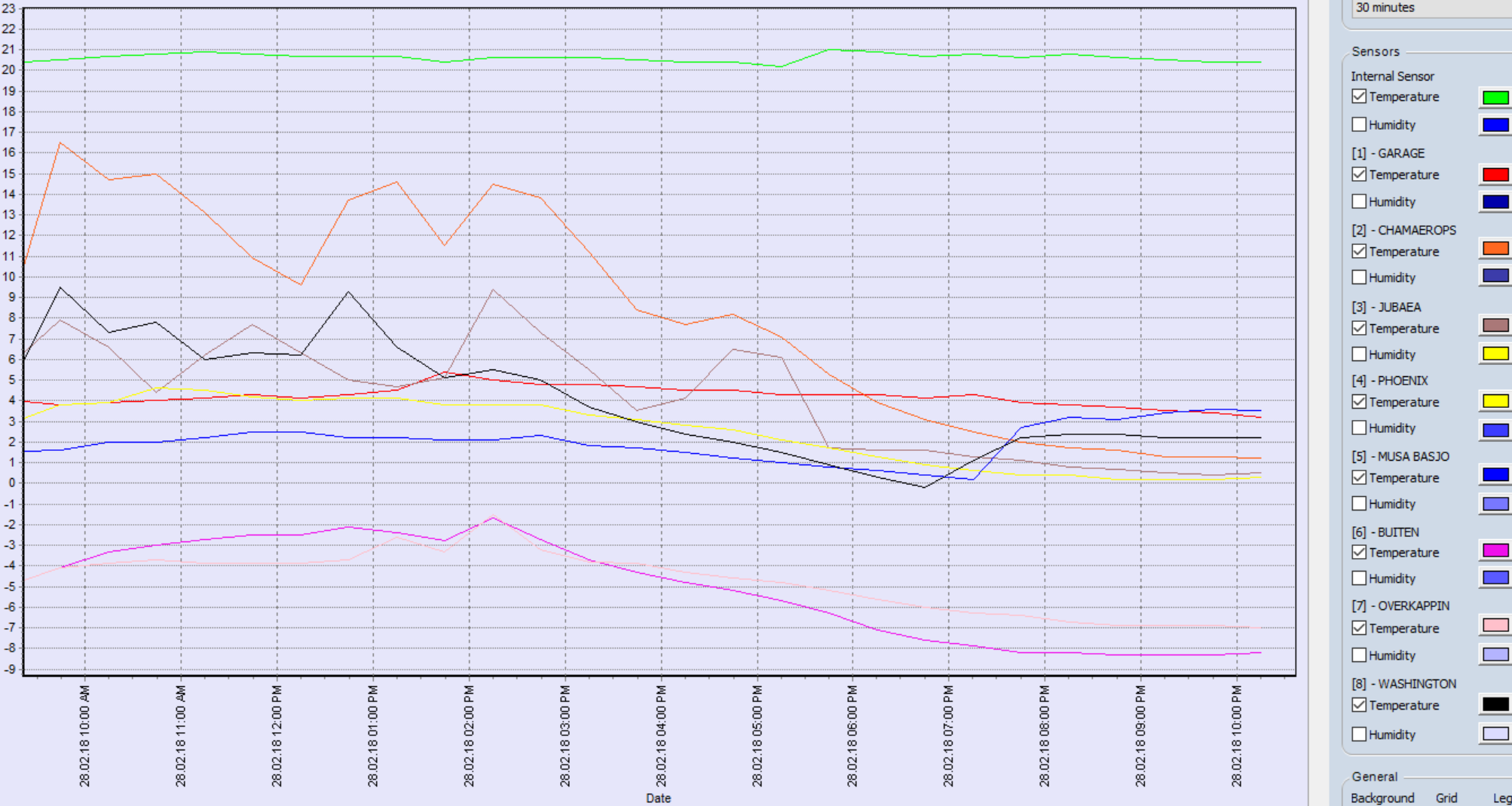 Jep, door de wind houd ik het ook maar net boven 0. Zie de afbeelding. Bij de basjoo-pol en de Washingtonia heb ik ingegrepen omdat de wind er teveel vat op had. Dat zie je meteen terug in een temperatuurstijging. De Phoenix hangt maar net boven 0, maar iets er onder zou toch geen probleem moeten zijn. Buitentemperatuur is nu al even stabiel op -8,3. Ik hoop dat het daar bij blijft, maar het zal vast nog wel wat gaan zakken mocht de wind wat gaan liggen..