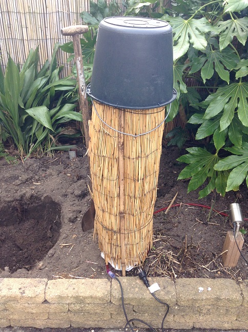 - eventueel wat aanmulchen aan de onderkant van de koker (tegen de wind).