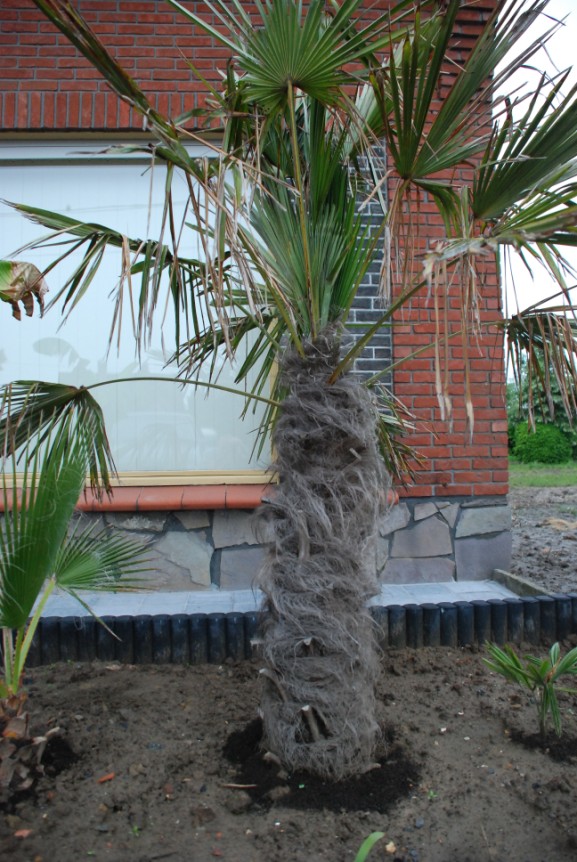 Ben je eigenlijk niet bang dat de Washingtonia te dicht bij de Trachy staat?