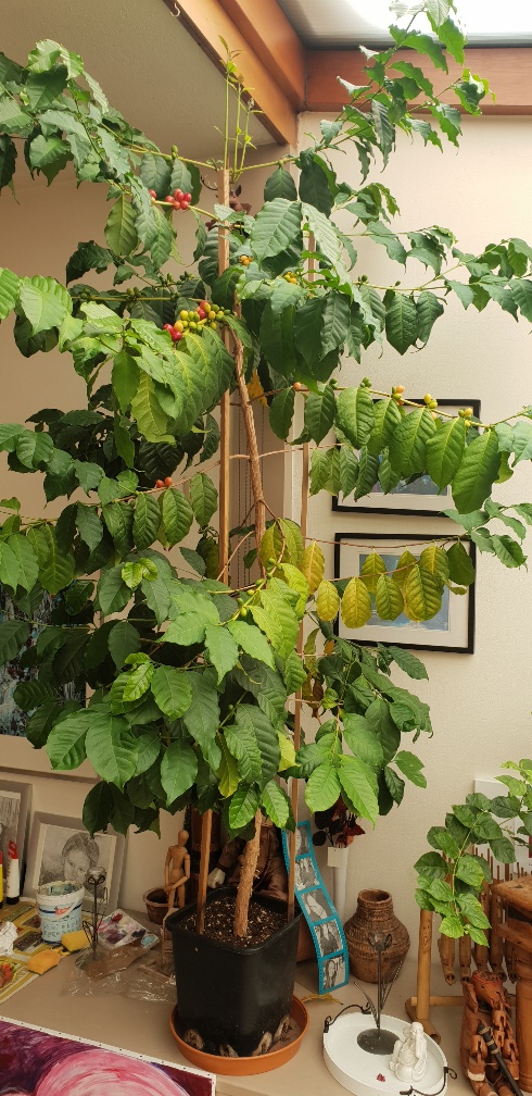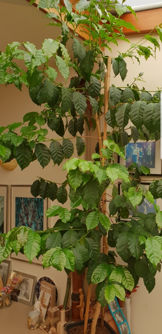 En weer 4 maanden verder inmiddels, geloofde er niet meer in dat de koffiebonen zouden verkleuren. Leuk om te zien dat dit nu gebeurd, wel tussendoor stevige top snoei moeten toepassen want hui had door het dak gewild :). Volgend jaar gaat deze verpot en gehalveerd worden.