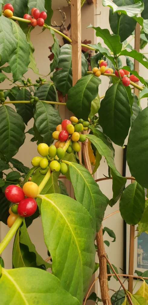 Ook bij ons in de tuin doet de koffieplant het goed.