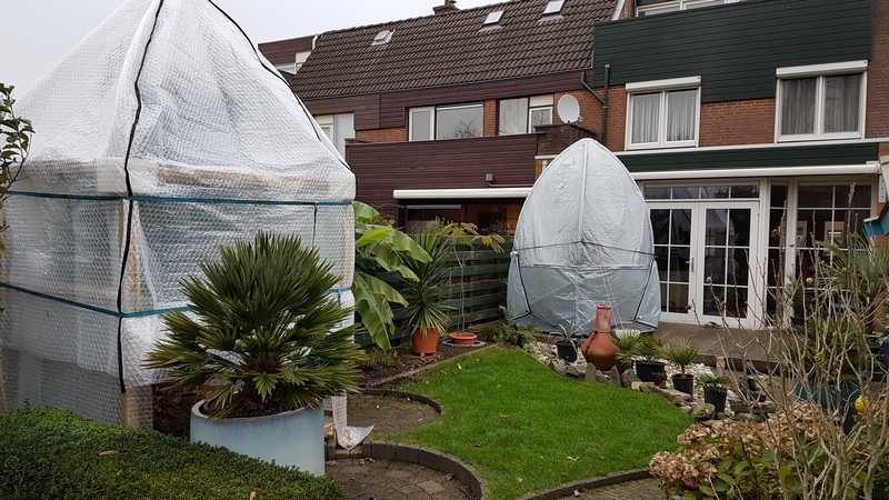 Ik kan pas eind april met een goede foto komen. Tot eind april laat ik 'm nog ingepakt staan. Vorig jaar stonden al mijn exoten begin april al buiten. Midden april kwam er ineens een onverwachte vorstperiode. Daardoor is toen het een en ander aan dierbare planten geneuveld. Dat wil je niet nog een keer. Beter is het nog een paar weken te wachten.
