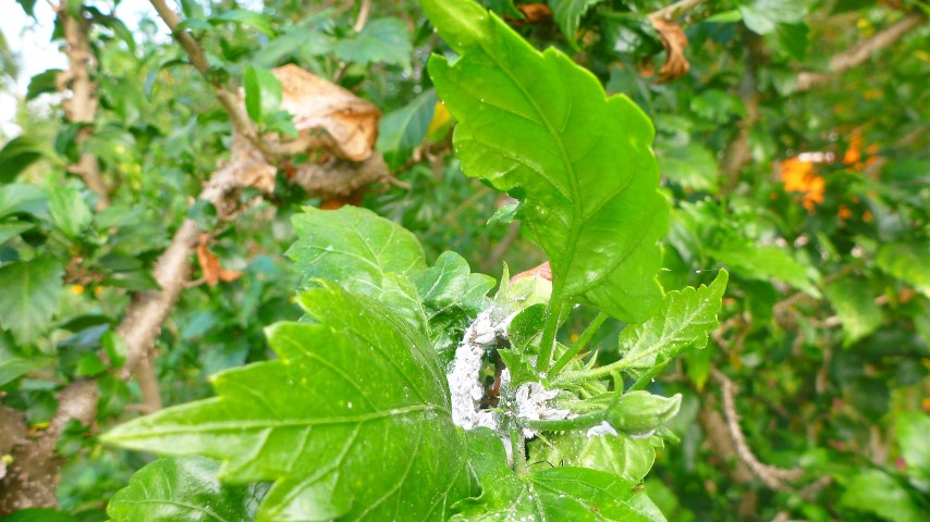 Ik heb een Hibiscus waar veel bloemen in kwamen. Maar nu blijven de bloemen in de knop en er zit iets wits op. Lijkt wel een luis of zo.