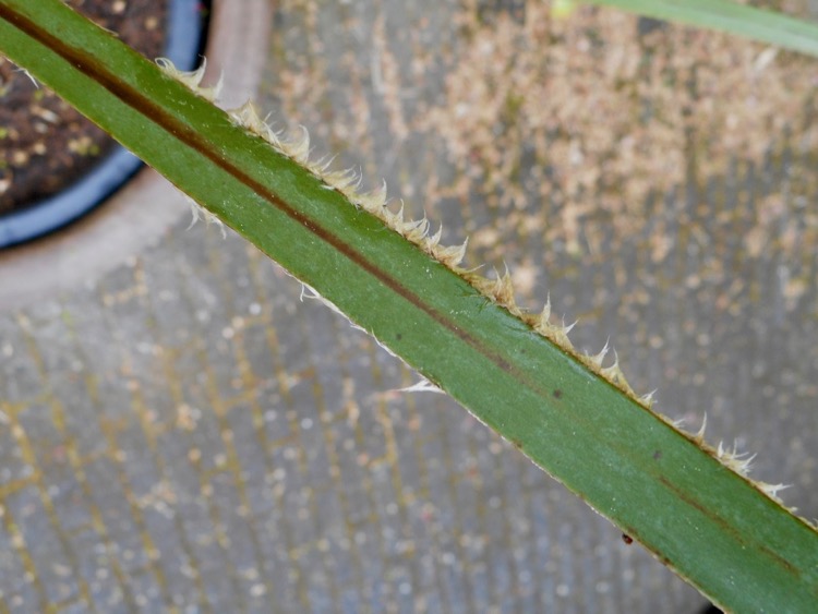 Als jouw palm een tomentum heeft langs de rand van de bladsteel is dat kenmerkend voor Trachycarpus martianus. Bovendien heeft deze palm relatief lange bladstelen. Het tomentum is het beste zichtbaar bij het jonge blad.