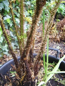 De boomvarens die ik vorig jaar als Dicksonia's heb vergaard krijgen nu nieuwe bladeren. De krullen verschillen echter nogal. Ik heb het vermoeden dat er Cyathea's bij zijn.