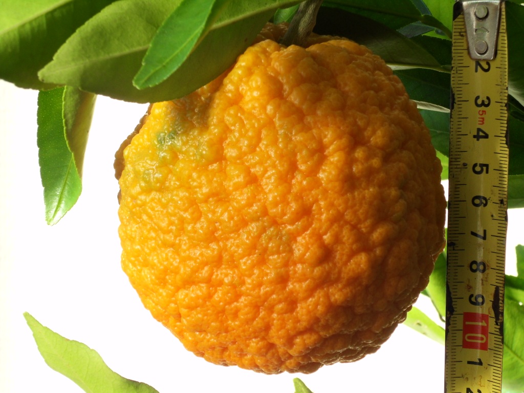Ongeveer twintig jaar geleden heb ik eens wat pitten gezaaid van een citrus ugli (Spreek uit; oeglie). Daar is nu nog één boompje van over dat in die tijd twee maal vrucht heeft gedragen. De laatste keer twee jaar geleden. Er waren toen twee vruchten die een lichte mandarijnsmaak hadden, maar van binnen erg droog waren. Dat kan aan de cultuur gelegen hebben de boom stond vrij droog te overwinteren in mijn hal. De vrucht zag er als volgt uit: