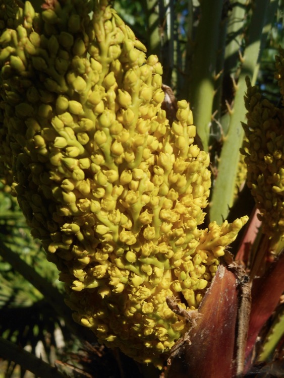 De bloeiwijze van de mannelijke palm is hier nog niet geopend.