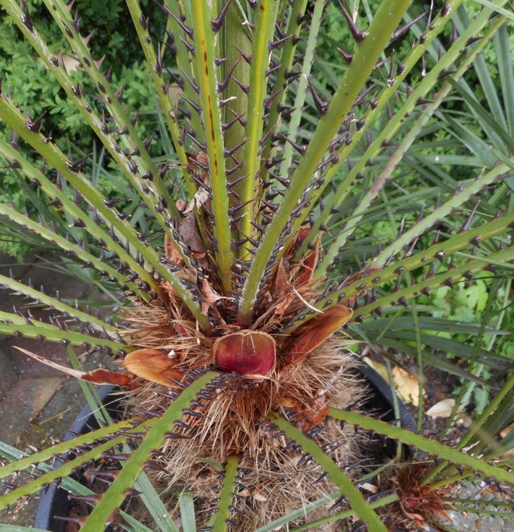 Ik heb een Chamaerops man (Cerifera) en 3 vrouwen. De hierboven afgebeelde humilis is daar een van; de Cerifera vrouw droeg vorig jaar zaad en lijkt dit jaar een pauze te houden. Bij de Cerifera man zijn de onrijpe bloemen nog door de schutbladen omhuld (afb.). Of de stoere zwarte doorns een kenmerk zijn van mannelijkheid, weet ik niet. :lol: En of het klikt tussen partners is afwachten, vorig jaar bleef de bestuiving van de afgbeelde vrouw zonder resultaat.