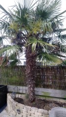 wij hebben in de tuin een palm die hier inmiddels al een jaar of 15 staat. Hij doet het goed en is inmiddels flink uit de kluiten gewassen. Ik denk vanaf de grond zo een 450 centimeter met een dikke stam.