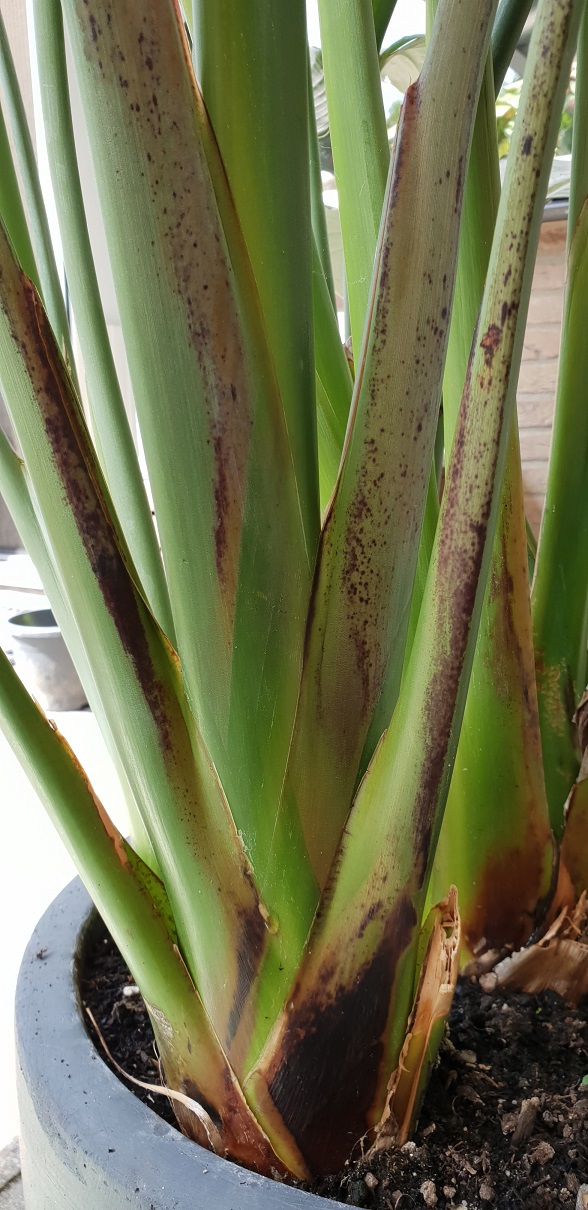 Een van mijn Strelitizia's, waar ik al jaren erg trots op ben, vertoont sinds enkele maanden donkere vlekken op de bladstengels en de basis. In 1e instantie dacht ik aan teveel water maar de overige planten in dezelfde pot hebben nergens last van. Ik kan verder geen schimmel of luizen ontdekken en ben bang dat de plant het steeds slechter gaat doen. De nieuwe bladeren zijn telkens echter mooi groen en stevig en de plant is verder in goede conditie.