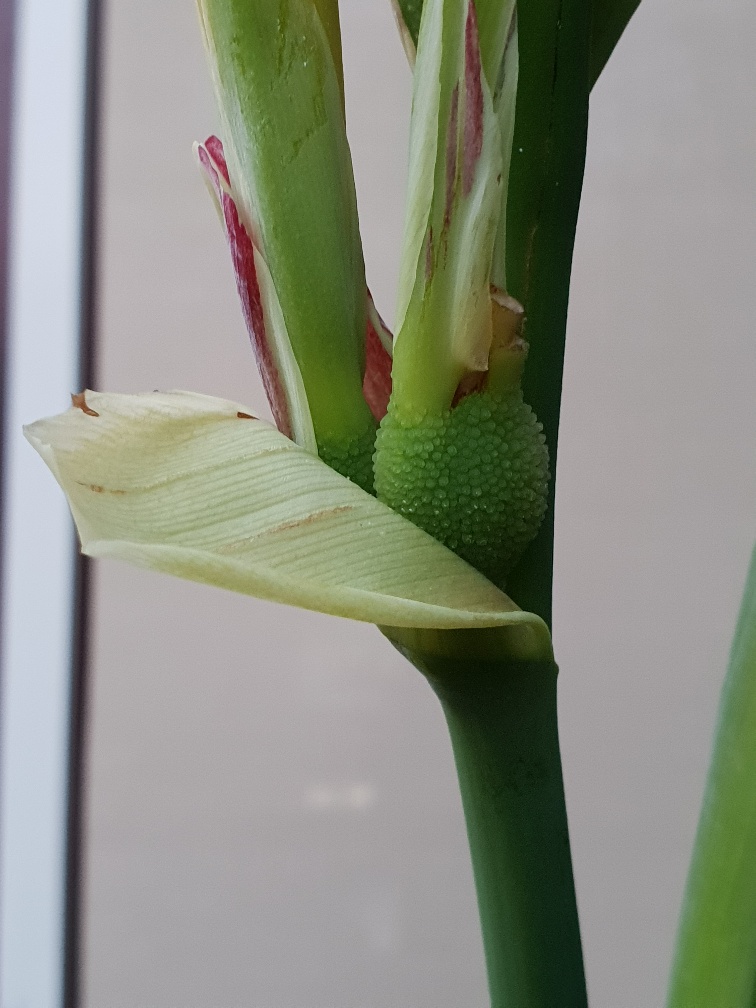 Hoi canna specialisten. Hier staat een canna cleopatra in bloei. Rode kleur gaat zelfs op sommige plekken volledig in de bloem door. Nu meldde Eddy dat de cleopatra niet te vermeerderen is via zaden. Wat zit er dan onder deze net afgevallen bloem? Of is dit geen cleopatra :oops: ?