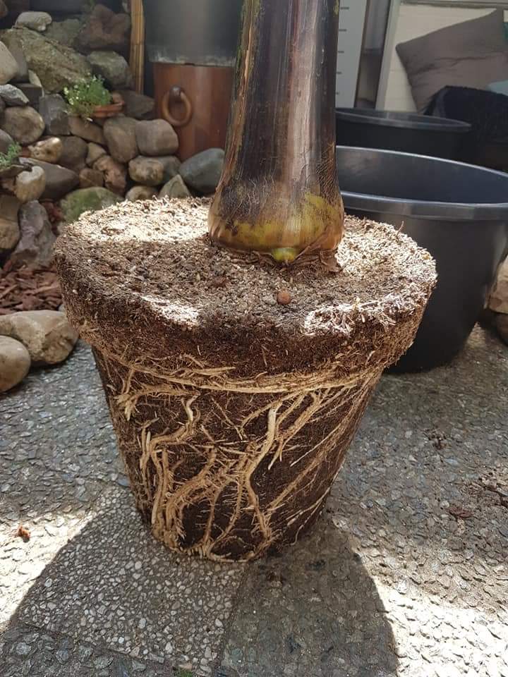 Bij het eruithalen uit de huidige kuip (26liter), kan je al goed zien dat er rondom een labyrint aan wortels gevormd is.