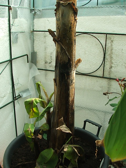 Vorig jaar had ik een dwarf cavendish gekocht, en die heeft het goed gedaan en de winter overleeft in de kas, maar toen heb ik hem in het voorjaar teveel water gegeven en is hij de pijp uit gegaan, maar ik heb desondanks de belaberde scheuten er afgesneden voordat hij de kliko in ging, en