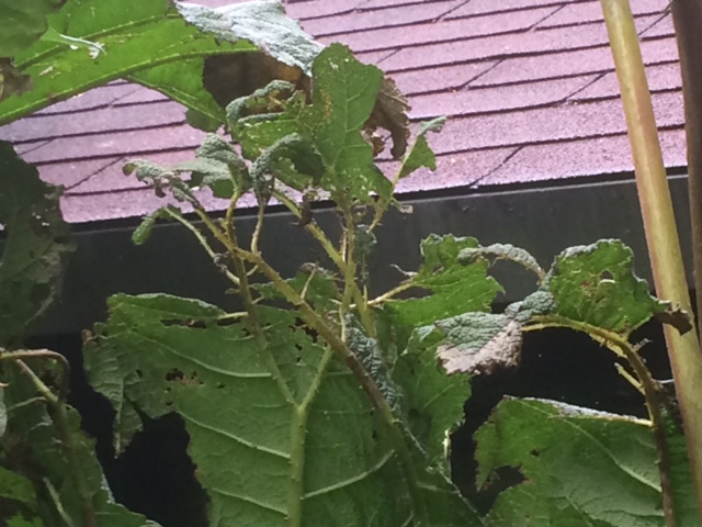 Ik had ook ineens een groot gat in 1 van m'n gunnera bladeren. Toen vond ik een felgroene soort sprinkhaan. Deze vriendelijk verzocht ergens anders te gaan wonen en daarna zijn de andere bladeren heel gebleven. Weet niet of het toeval was. Ook heb ik een rode leliekever weggehaald.