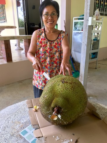 Bij ons in de tuin staan diverse Jackfruit bomen, Artocarpus heterophyllus, en de vruchten worden soms aangevreten door de vele eekhoorns, Callosciurus finlaysoni, die hier ook wonen.