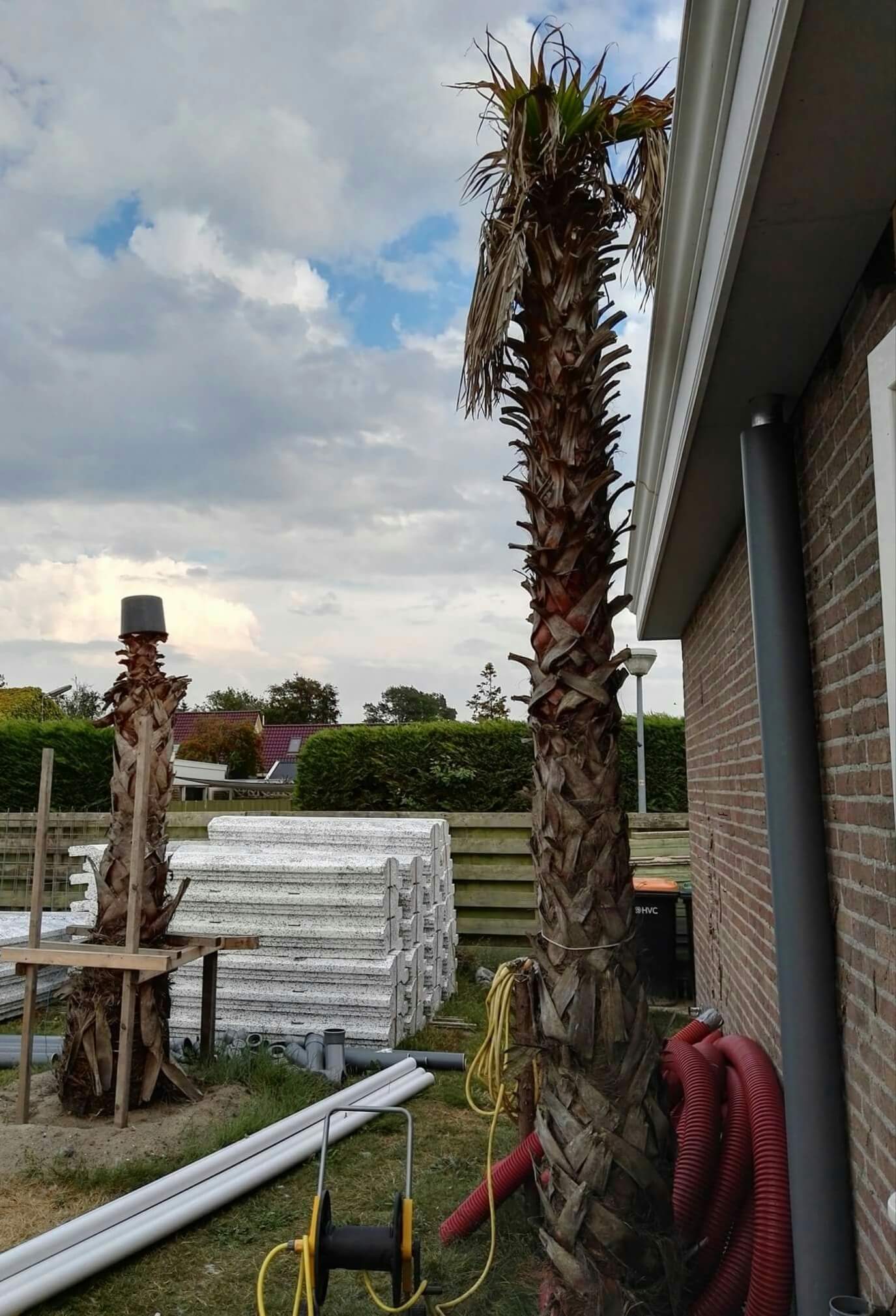 Dan gaat er toch iets niet goed. Als je in je bescherming twee nieuwe bladeren krijgt, dan is het duidelijk te warm in je bescherming. 16 m is wellicht ook veel te veel. Nieuwe balderen in de winterperiode zijn zwak, want er is te weinig licht, zeker in een verpakking. Speerrot ligt dan inderdaad voor de hand. Je zult je bescherming moeten perfectioneren. Ik raad je aan de temperatuur te monitoren en je verwarming daarop in- en uit laten schakelen. De temperatuur moet je niet hoger dan 4 of 5 graden laten worden, tenzij het weer buiten daar voor zorgt. Met een warmtelint kun je ook zorgen dat het niet onder 0 komt, ook daar is een thermostaatje handig voor. Ik ben bang dat het nu niet meer goed komt met je palm. Ik hoop voor je dat ik het mis heb. Mocht er nog wat leven in zitten, dan zou ik de palm weer goed beschermen en zorgen voor het bovenstaande. Inpakken zonder dat het plastic de stam raakt en met een warmtelint en thermostaat de temperatuur goed controleren. Dat kan ook met een thermometer, maar dan moet je even scherp zijn in perioden met vorst. En de stekker er uit trekken als het niet vriest!