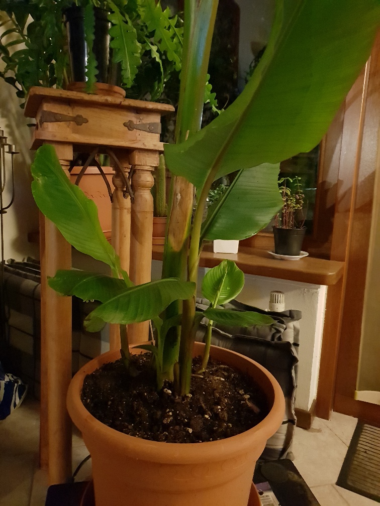 Vrouwlijke banaantjes zijn al lekker aan het bollen, hopelijk rijpen ze tot de zaadjes deze keer. De schutbladeren met manlijke vallen er met bosjes af, geen idee of ze sneller zouden rijpen met het laatste stukje bloem eraf, voorlopig maar laten hangen dus..... Ook zoals bij alle andere bananen die in de bloei komen knallen de pups werkelijk naar al redelijk hoogte, blad toppen zitten nu al tot net onder de bloem, verbaasd dat dit zo snel gaat.