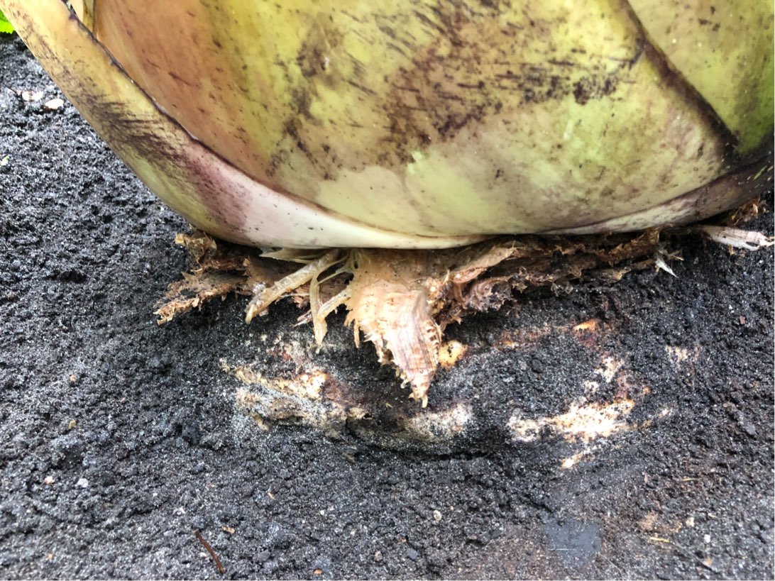 Heb je kunnen zien of er veel van de "voet"/rhizoom (of hoe heet dat bij bananen) is afgesneden? (lijkt niet zoveel)