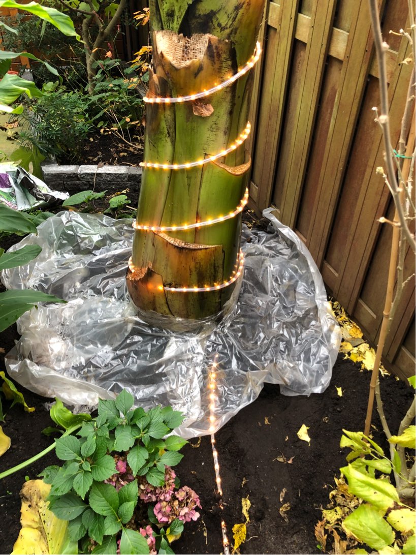 Vandaag mijn ensete op vergelijkbare manier ingepakt als vorig jaar. Om de stam een beetje grond weg gehaald, plastic neergelegd, turf erop met lichtslang om de stam, daar breed plastic omheen om de grond zo droog mogelijk te houden. Daarna vochtregulerende hoes om de plant. Bij zeer lage temperaturen zal er een extra vliesdoek laag onder de hoes komen.