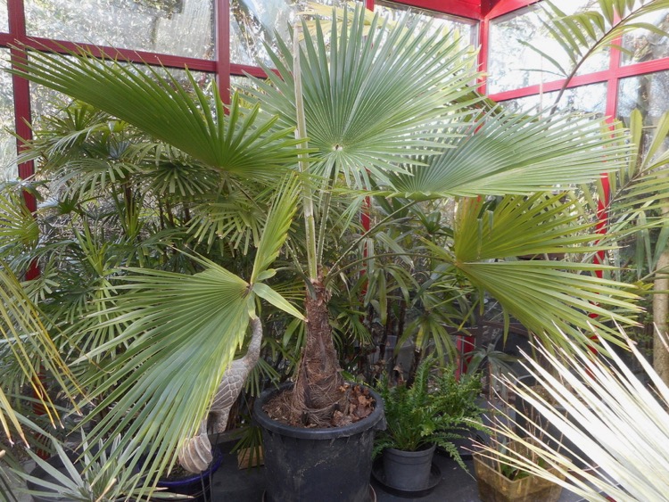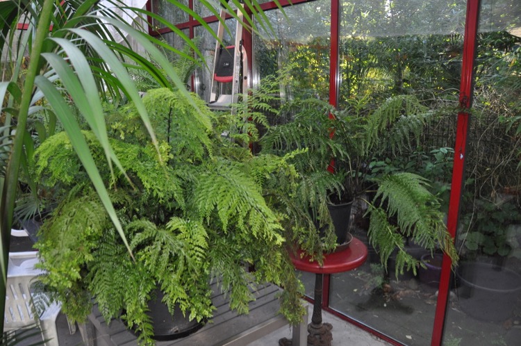 Ik prijs me gelukkig in het bezit van een plantenkas zodat niet meer 's winters de slaapkamers vol staan met kuipplanten. Een paar soorten overwinteren nog wel binnenshuis omdat die de min. kastemperatuur van ± 2°C niet overleefden ondanks hun vermeende tolerantie voor lage temperaturen. Het meerendeel van de kuipplanten verdraagt echter temperaturen tot om en nabij het vriespunt. Terwijl Chamaedorea elegans verrassend goed koude blijkt te verdragen, sneuvelden eerder Howea, Phoenix roebelenii en Ravenea glauca. Van de laatste is nu nog 1 exemplaar over en die staat weer tijdelijk in de woonkamer. Howea forsteriana en Dypsis decaryi die evenals Ravenea in de zomer in de tuin staan, overwinteren bij 10-15°C. Yucca, Cordyline en palmsoorten die matige vorst verdragen staan nog buiten, i.e. Butiagrus, Chamaerops en Trachycarpus sp.