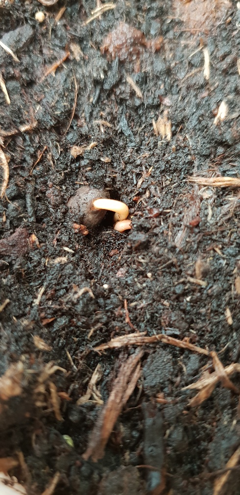 Resultaat was reeds 1e kiemelingen na slechts 18uur!! Deze 1e batch heb ik in hetzelfde zaaimedium gelegd met de bolle kanten naar boven en afgesloten in folie ook op de radiator geplaatst.