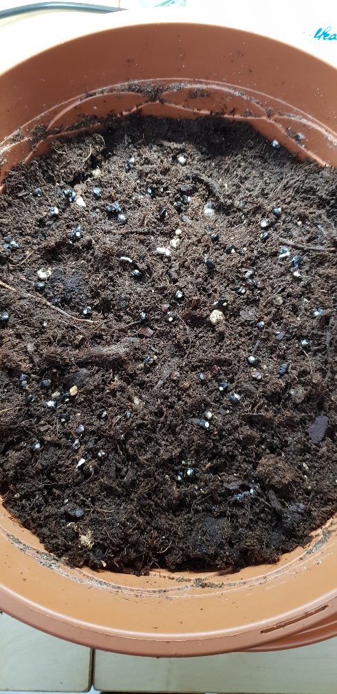 4. compleet out of the box, mijn oude pot met wegrottende velutina rhizoom losgepeuterd in restant dus van palmaarde en niet schoongemaakte zaden verspreid over het oppervlak, beetje door elkaar gehusseld en aangedrukt, plastic zak voor vochthuishouding erover.