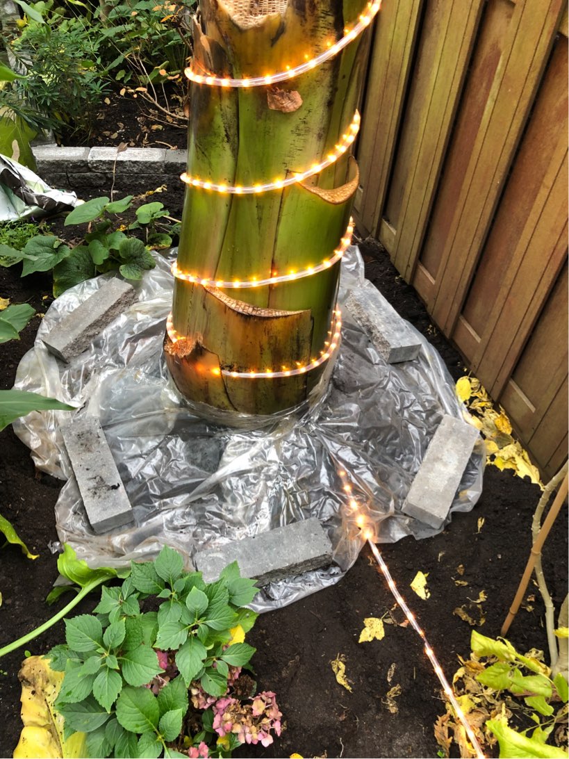 Vandaag mijn ensete op vergelijkbare manier ingepakt als vorig jaar. Om de stam een beetje grond weg gehaald, plastic neergelegd, turf erop met lichtslang om de stam, daar breed plastic omheen om de grond zo droog mogelijk te houden. Daarna vochtregulerende hoes om de plant. Bij zeer lage temperaturen zal er een extra vliesdoek laag onder de hoes komen.