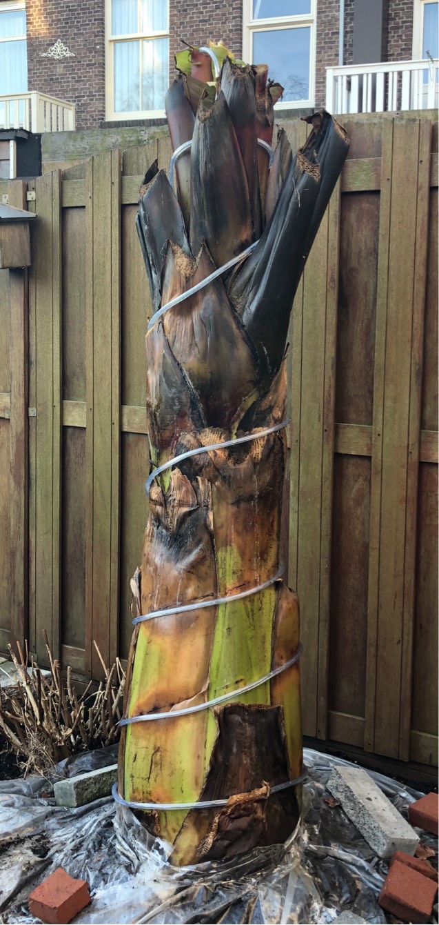 Vanwege het aangename weer haal ik voorlopig de hoes van de ensete. Zo kan hij een beetje drogen en wennen aan licht. Lichtslang blijft eromheen zodat ik alleen de hoes eromheen hoef te doen als het toch weer koud wordt.