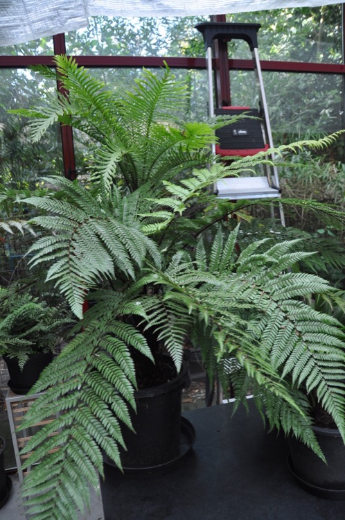Dat zie je goed Eduard - Dicksonia squarrosa (met op de achtergrond Blechnum gibbum) was mijn eerste aanwinst en is altijd een van mijn favoriete boomvarens gebleven met zijn rossig gekleurde jonge veders en pups. Door de hoogte kun je breed uitstaande palmen hoger zetten. Naarmate de kuipen zwaarder worden en ikzelf een dagje ouder, lukt me dat niet meer alleen en moet ik vaker een buurman te hulp vragen.